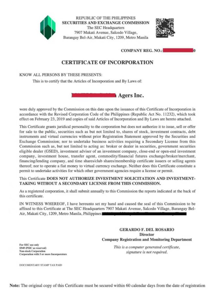 菲律宾公司注册的主管机关为 Securities and Exchange Commission(SEC,菲律宾证券交易委员会)。